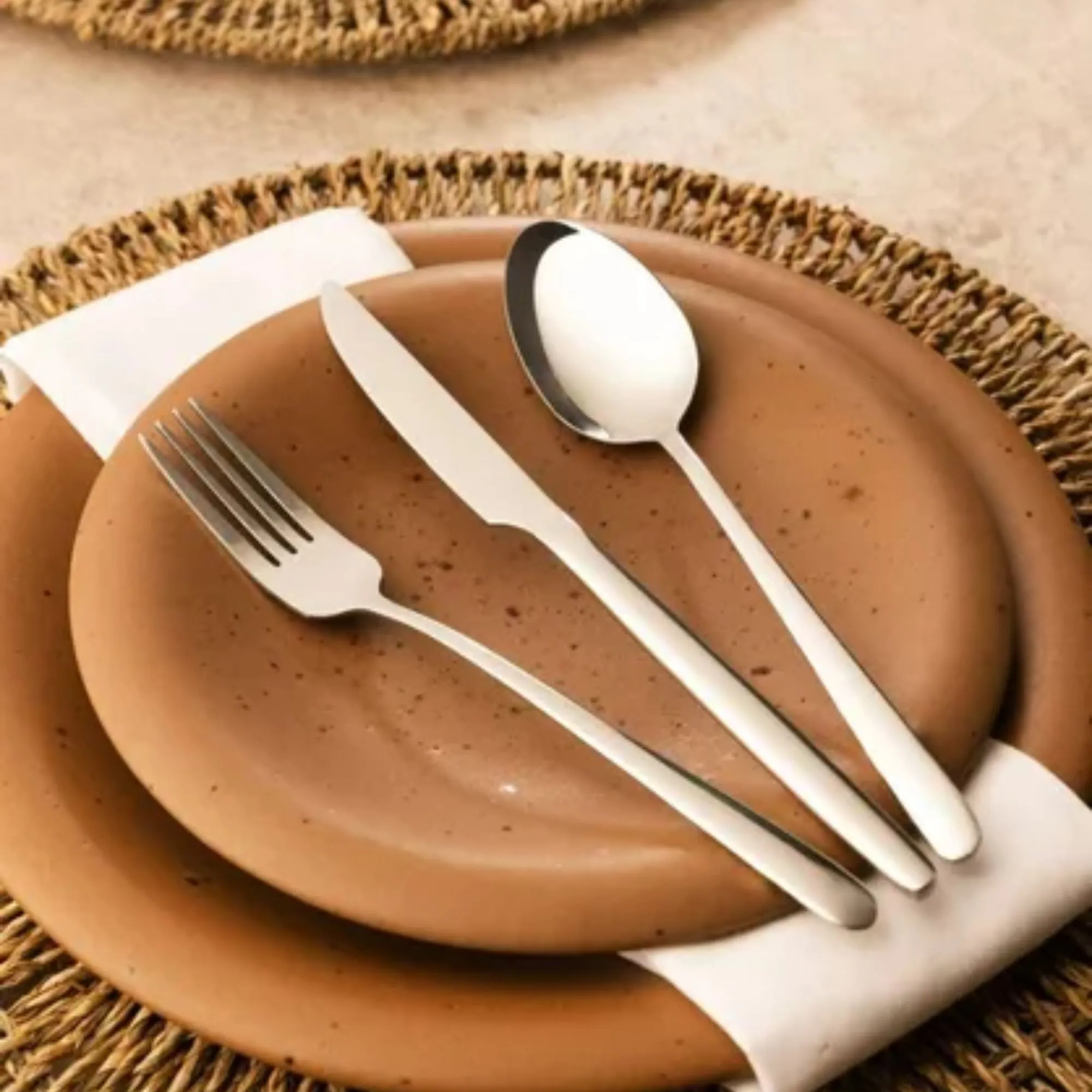 Material Premium Fabricado em Aço Inox de alta qualidade, garantindo resistência excepcional, brilho duradouro e proteção contra corrosão. É um investimento em talheres de luxo duráveis.