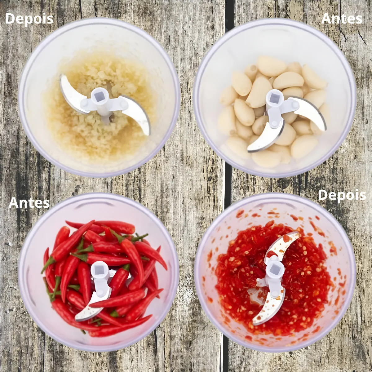 - Capacidade: Possui um recipiente de 500ml (também encontrado comercialmente como 480ml em algumas variações de lote), sendo ideal para picar cebola, alho, ervas e grãos.