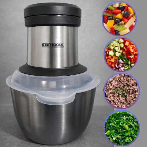 O Processador elétrico gourmet da startools, é uma versão mais robusta e potente do que o modelo mini, projetado para lidar com volumes maiores de alimentos e preparos mais pesados na cozinha.